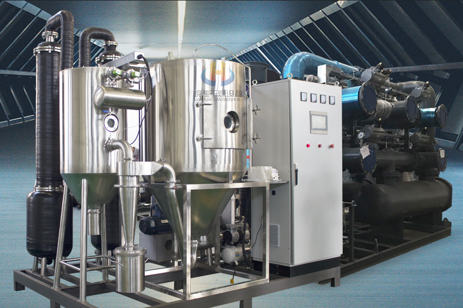 閉式循環(huán)噴霧干燥機(jī)系統(tǒng)由噴霧干燥機(jī)主機(jī)、帶空氣過濾器的加熱器、鼓風(fēng)機(jī)、水氣分離器、大小冷卻塔、噴淋塔、排風(fēng)機(jī)、一級旋風(fēng)分離器、二級旋風(fēng)分離器、泵、測氧儀以及管路與控制閥等組成。